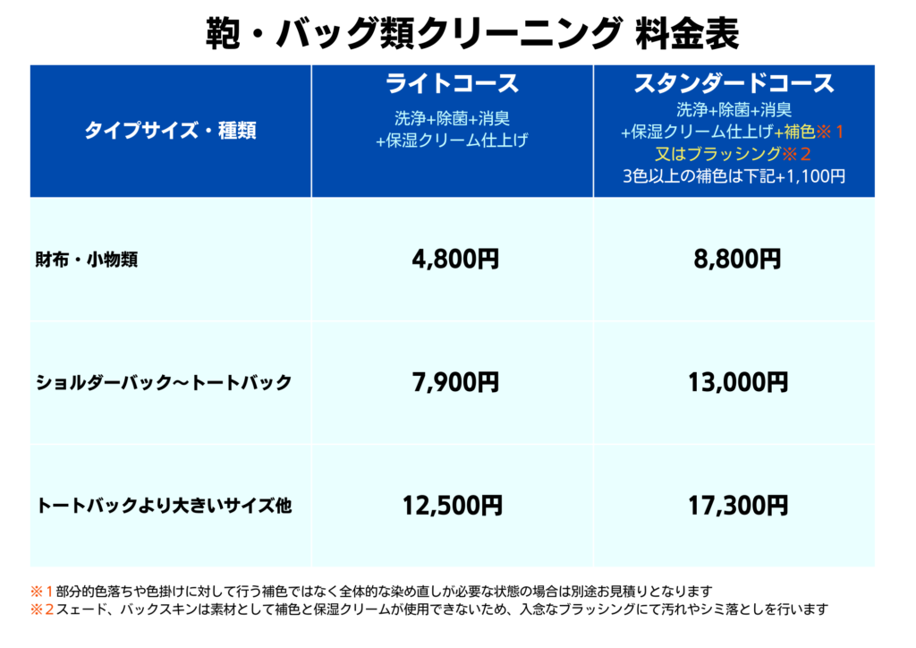 バッグ&お財布等クリーニング基本料金表